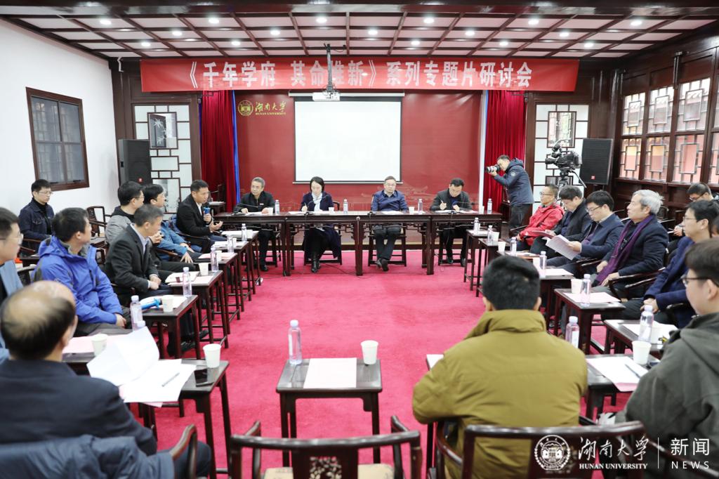 11月25日下午,《千年学府 其命惟新》系列专题片研讨会在湖南大学党委宣传部(新闻办公室)岳麓书院明伦堂举行。湖南广播电视台副台长徐蓉,校党委常委、副校长谢赤,湖南省委宣传部对外推广处处长陈宏等出席研讨会。校党委常委、宣传部部长兼马克思主义学院院长唐珍名主持会议。