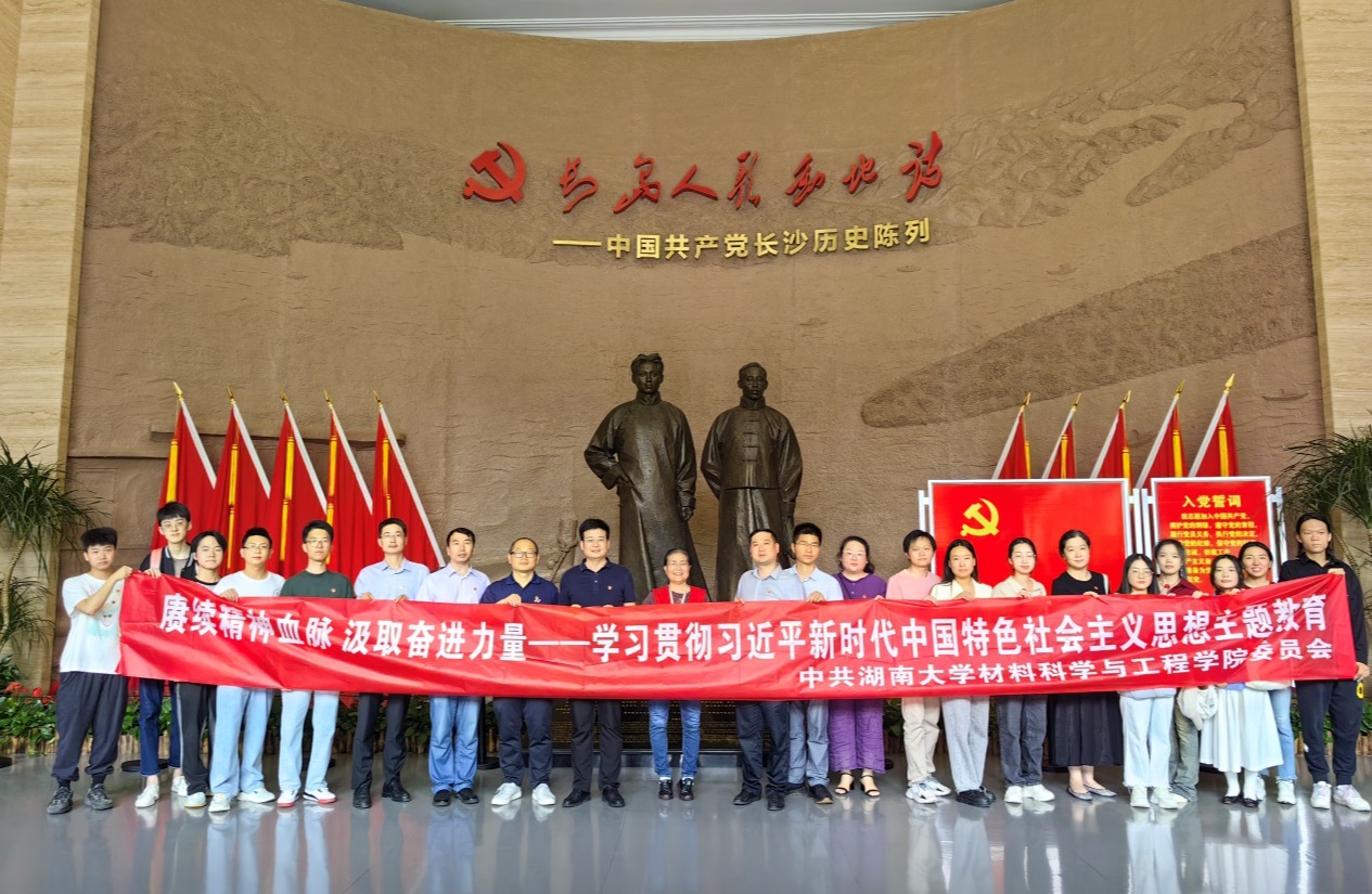 5月25日下午,材料科学与工程学院党委组织开展“赓续精神血脉 汲取奋进力量”主题教育活动,赴中国共产党长沙历史馆进行实地研学。学院党委理论学习中心组成员、信息功能材料研究生三支部党员代表参加。师生们参观了中国共产党长沙历史陈列馆、中共湘区委员会旧址等场馆,深入了解感受中国共产党组织领导湖南人民奋斗发展的光辉历程和取得的辉煌成就。大家表示,没有共产党就没有现在的幸福生活,将坚定理想信念和初心使命,以...